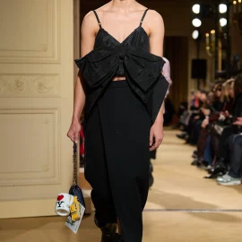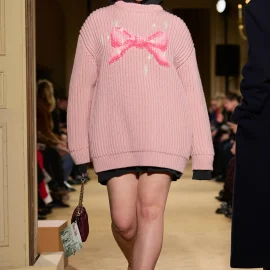 Meanwhile, dresses, tuxedo jackets, and pants explored creative tailoring and a variety of silhouettes for a sophisticated look. Voluminous layered skirts and loose-fitting pink knit sweaters also incorporated ribbon motifs for a softly sweet vintage feel.