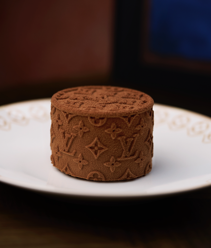 さらに、デザートタイムにはフランス伝統の「アントルメ」が登場。多層構造のデザートは、バニラ、ヘーゼルナッツ、チョコレートの3種が揃い、それぞれがルイ・ヴィトンの象徴的なフレーバーとして洗練された味わいを提供する。