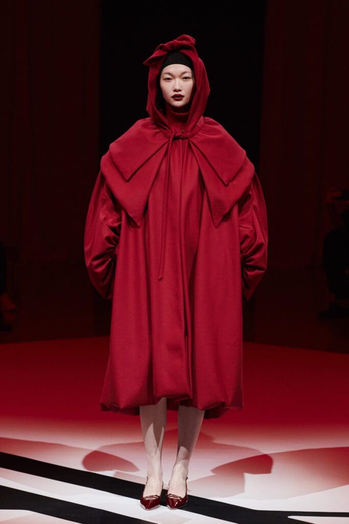 ショーでは、ヘンネの基盤となる「強きロマンチスト」の色、愛の赤、優しきベージュ、芯の強さを表す黒を軸に、フリルやチュールを多用したボリュームのあるドレスが数々登場。エッジを効かせたり、ティアードのように重ねたり、不規則なテクスチャーが組み合わせたりと、プレタポルテでありながらも、オートクチュールでしか再現できないようなロマンティックでエレガントな要素を存分に詰め込んだ。