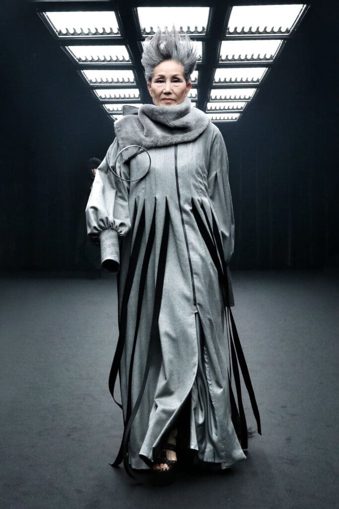 ウール地のジャケットは、均整を崩すように裾を波打たせ、ストールと融合するように肩から流れ落ちる。また、グレーのワンピースは、布と布のあいだに「間」を抱き、身体と空間を交錯させる。このように、整えられた輪郭を一度壊すことで生まれる“未完成”のラインが、むしろ「完成以上の豊かさ」を讃えているようだった。